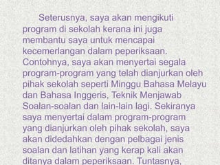 Usaha Mencapai Kecemerlangan dalam Peperiksaan. Kita mestilah bertanya kepada guru sekiranya tidak faham tentang sesuatu topik pelajaran. Menjadi batu loncatan untuk seseorang murid itu menyambung pengajian di institusi pengajian tinggi.